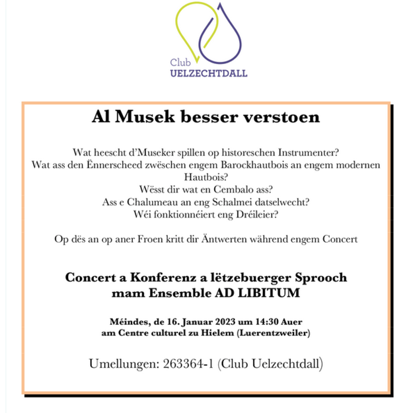 Nomëttes, den 16. Januar 2023, hat den Club Uelzechtdall (a.s.b.l.) den Rosch Mirkes an Musekerfrënn vum Ensembel Ad Libitum zu enger Aféierung an d'Welt vun der Aler an Barock Musek agelueden, ënnert dem Motto